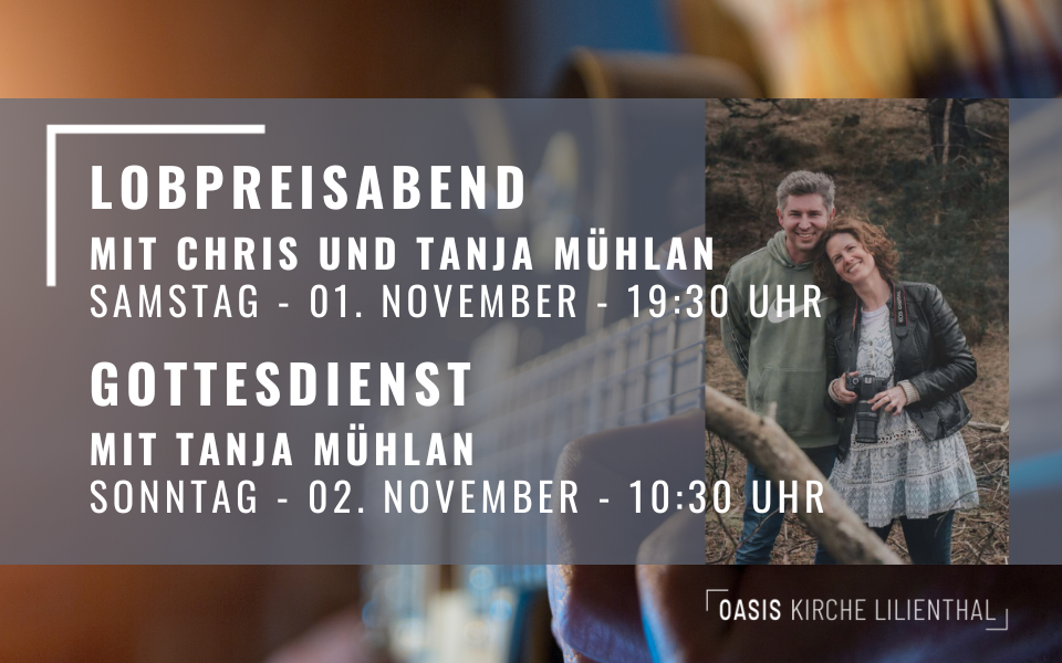 Wir freuen uns sehr, über den Besuch von Chris und Tanja Mühlan! Das Ehepaar aus Braunschweig, möchte uns an diesem Wochenende im Lobpreis und als Gastsprecher dienen. Am Samstagabend, den 01. November bist Du herzlich eingeladen, Dich mit in einen Lobpreis hineinnehmen zu lassen, der Dich zum Vaterherz Gottes führt! Wir starten ab 19:30 Uhr im Gemeindesaal. Am Sonntag, den 02. November freuen wir uns auf einen besonderen Gottesdienst, mit einer Predigt von Tanja Mühlan. Sei gerne ab 10:30 Uhr vor Ort oder per Livestream bei YouTube dabei!