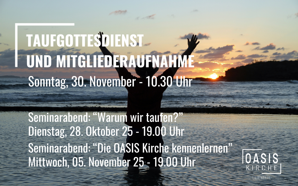Du hast Jesus in Dein Herz eingeladen und möchtest Dich gerne taufen lassen? Du bist schon getauft und hast Fragen zur Mitgliedschaft in unserer Kirche? Dann sei gerne bei unseren Seminarabenden am Dienstag, den 28. Oktober („Warum wir taufen?“) sowie am Mittwoch, den 05. November („Die OASIS Kirche kennenlernen“) dabei. Hier kannst Du alle Deine Fragen zu Taufe und Mitgliedschaft stellen und Dich zur Taufe anmelden. Wir treffen uns jeweils um 19:00 Uhr im Schulungsraum. Bitte melde Dich entweder über die ausliegenden Flyer oder per E-Mail unter info@oasiskirche.de an. Wir freuen uns auf Dich!