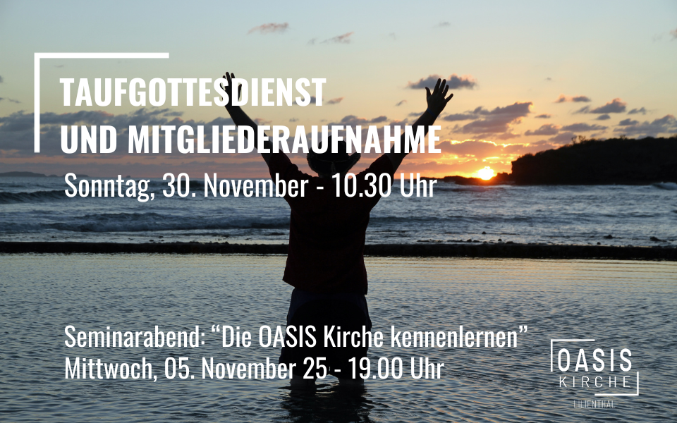 Du bist schon getauft und hast Fragen zur Mitgliedschaft in unserer Kirche? Dann sei gerne bei unserem Seminarabend am Mittwoch, den 05. November „Die OASIS Kirche kennenlernen“ dabei. Hier stellen wir uns als Kirche vor und beantworten Deine Fragen zur Mitgliedschaft. Wir treffen uns um 19:00 Uhr im Schulungsraum. Bitte melde Dich entweder über die ausliegenden Flyer oder per E-Mail unter: info@oasiskirche.de an. Wir freuen uns auf Dich!