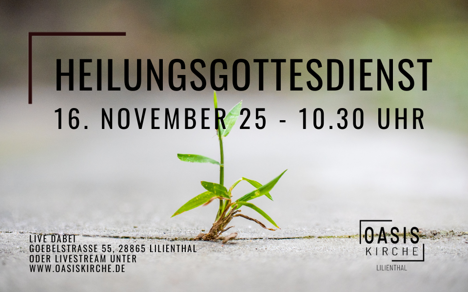 Wir erleben immer wieder, dass Gott heute noch heilt und Wunder tut. Lass Dich in unserem Heilungsgottesdienst am Sonntag, 16. November ermutigen, auf Gottes Wirken zu vertrauen und Heilung zu empfangen! Im Anschluss an den Gottesdienst bietet unser Gebetsteam persönliches Gebet für Erkrankte und deren Angehörige an. Du bist herzlich eingeladen, ab 10:30 Uhr vor Ort oder im Livestream bei YouTube dabei zu sein!