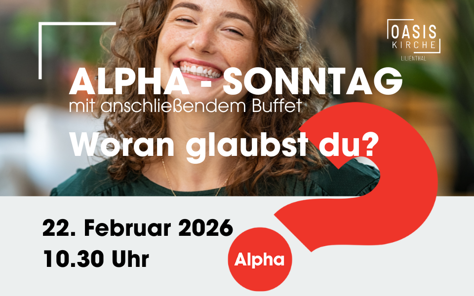 Suchst Du Antworten auf die großen Fragen des Lebens? Dann bist Du bei ALPHA genau richtig! ALPHA ist der Kurs für Sinnsucher! Zur Vorbereitung starten wir mit unserem ALPHA – SONNTAG, am 22. Februar 2026 ab 10:30 Uhr. Es erwartet Dich ein toller Gottesdienst mit Infos zum ALPHA KURS und anschließendem Buffet. Unser neuer ALPHA KURS findet dann ab dem 05. März 2026 immer donnerstags ab 19:00 Uhr statt. Weitere Informationen sowie Anmeldemöglichkeiten findest Du hier auf unserer Website unter „Glaubenskurs ALPHA“ oder unter folgendem Link: https://ccoasis.church.tools/publicgroup/1239