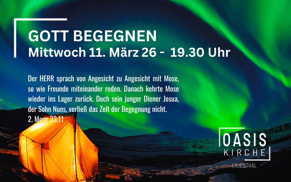Am Mittwoch, den 11. März bist Du herzlich eingeladen, inne zu halten und Gott zu begegnen. Lasst uns gemeinsam vor unseren Gott treten, auftanken und seine Nähe genießen! Wir treffen uns um 19:30 Uhr im Gemeindesaal. Wir freuen uns auf Dich!