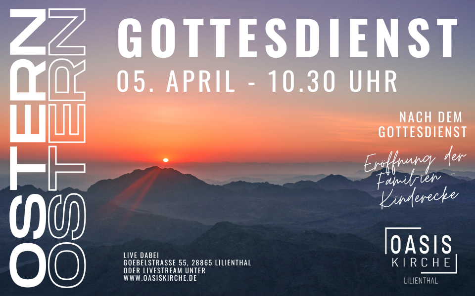 Lasst uns Ostern feiern, denn Jesus ist auferstanden! Dadurch hat sich für uns alles verändert und wir dürfen voller Hoffnung leben! Wir laden Dich und Deine Familie ganz herzlich zu unserem Ostergottesdienst am Sonntag, den 05. April ab 10:30 Uhr ein, entweder in unserer Kirche oder per Livestream. Im Anschluss an den Gottesdienst eröffnen wir unsere neue Familien-Kinderecke im Erdgeschoss der OASIS, mit einem Kuchenbuffet. Wir freuen uns auf Dich!