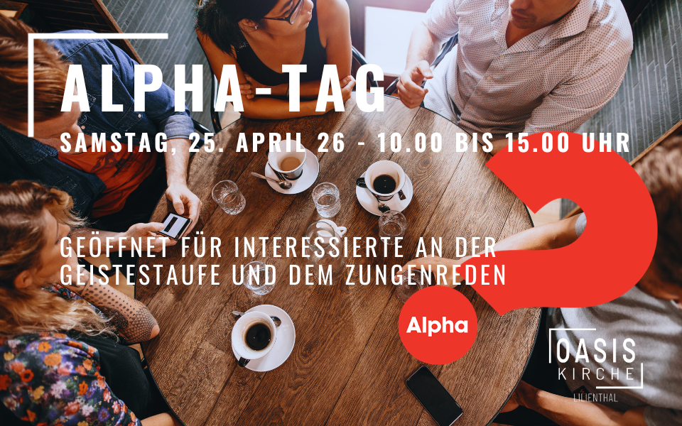 Nach den tiefgehenden bisherigen Wochen im Alpha Kurs, wollen wir uns am Samstag, den 25. April von 10:00 bis 15:00 Uhr im Rahmen des Alpha-Tages mit der Geistestaufe und dem Zungenreden beschäftigen. Wir werden dieses Thema theoretisch betrachten und praktisch ausprobieren. Lass Dich überraschen, wie tief und weit Gottes Gegenwart und Zurüstung reichen kann! Wenn Dich dieses Thema interessiert, dann komm gerne vorbei! Bei Fragen und zur Anmeldung, nutze gerne folgenden Link zu ChurchTools: https://ccoasis.church.tools/publicgroup/1239