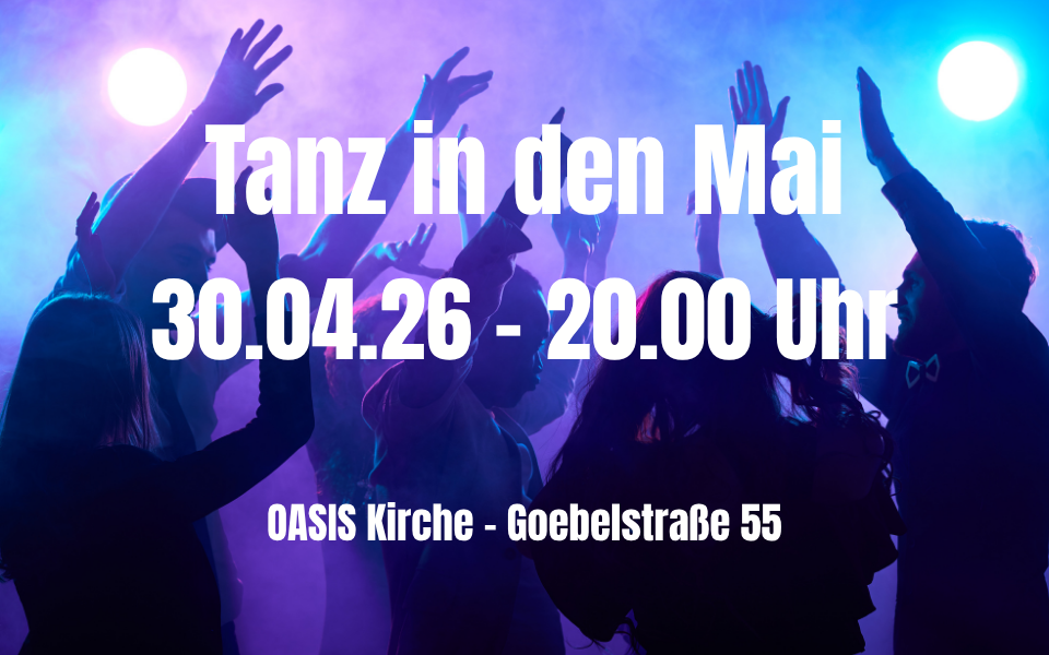 Tschüss Winter, hallo Frühling… Wir tanzen in den Mai: Christlich, gemütlich, mit Cocktails und ganz viel Spaß! Sei am Donnerstag, den 30. April ab 20:00 Uhr in der OASIS Kirche dabei und feiere bei toller Lobpreismusik und in netter Gesellschaft in den Mai! Wir freuen uns auf Dich!