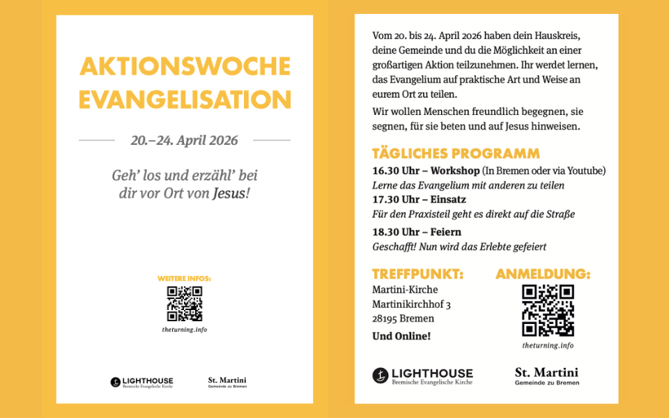 Unter der Federführung vom Lighthouse Bremen und der St. Martini – Gemeinde findet vom 20. bis zum 24. April die „Aktionswoche Evangelisation“ in Bremen und umzu statt. Wir haben die Möglichkeit an dieser tollen Aktion teilzunehmen und die rettende Botschaft des Evangeliums ganz praktisch und vor Ort weiterzugeben! Am Mittwoch, den 22. April und am Freitag, den 24. April findet jeweils ab 16:30 Uhr ein Workshop im Schulungsraum der OASIS statt. Im Anschluss daran sind wir ab 17:30 Uhr in Lilienthal zum Outreach unterwegs. Wenn Du dabei sein möchtest, dann melde Dich gerne vorab kurz per Mail bei Axel Dohle unter pastor@oasiskirche.de, Wenn Du nicht dabei sein kannst, dann unterstütze die Aktion im Gebet! Wir freuen uns auf spannende Begegnungen und Gottes Wirken! Hier geht`s zur Videobotschaft vom Lighthouse Bremen: https://youtu.be/mi-WMxQOSvs?si=pdFRITail484_obO
