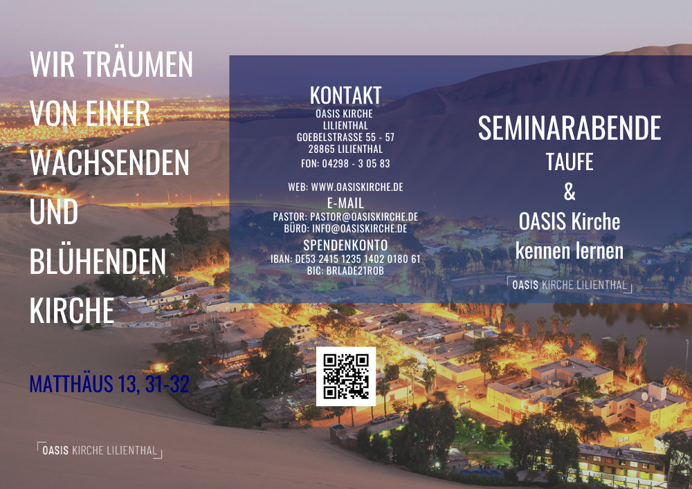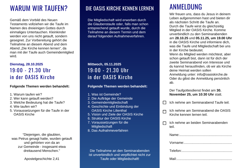 Du hast Jesus in Dein Herz eingeladen und möchtest Dich taufen lassen? Du bist schon getauft und möchtest gerne Mitglied in unserer Kirche werden? Dann sei gerne bei den Seminarabenden „Warum wir taufen? und „Die OASIS Kirche kennenlernen“ dabei und informiere Dich unverbindlich zu den Themen Taufe und Mitgliedschaft. Anmeldung bitte entweder über die Infoflyer (Abgabe im OASIS Bürobriefkasten, oberer Flur) oder per E-Mail an: info@oasiskirche.de.